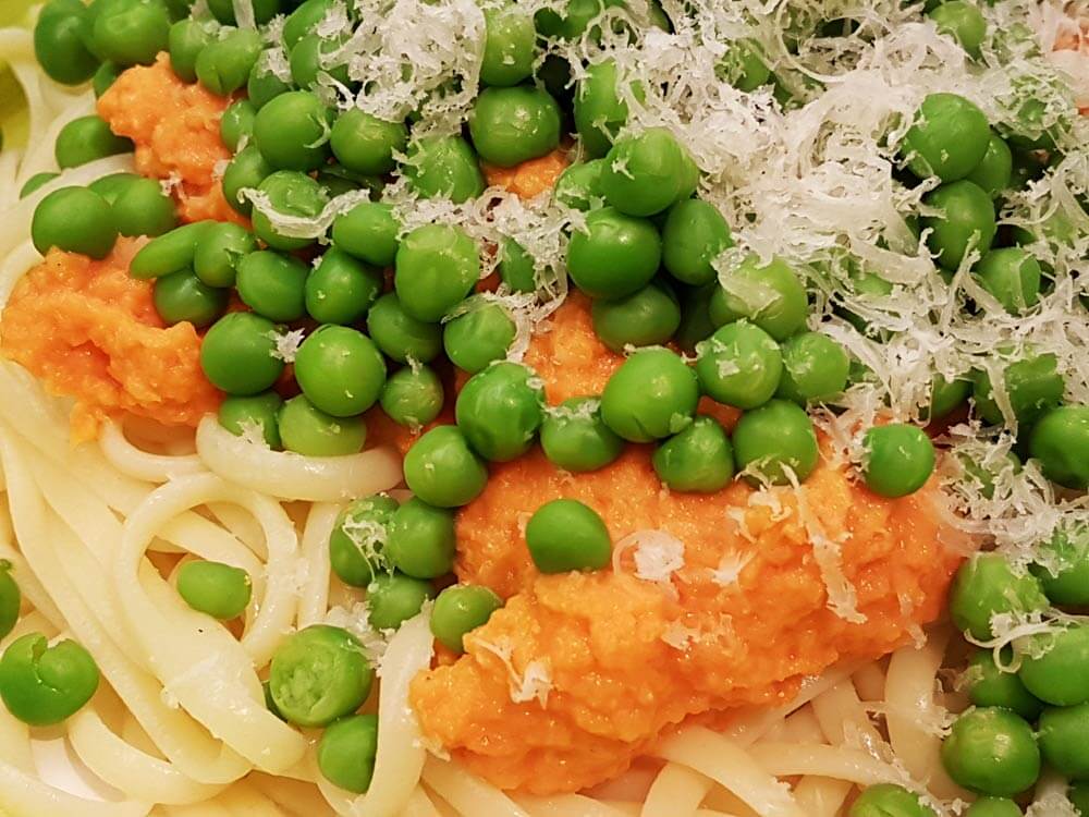 - Serveer de capellini met wortelsaus in diepe (pasta)borden. Strooi er de erwtjes overheen. Rasp er als laatste wat verse parmigiano over.